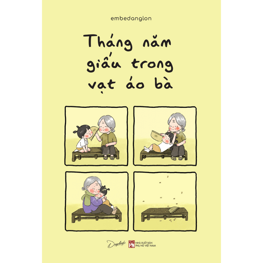 “Tháng năm giấu trong vạt áo bà” là cuốn sách tranh khẽ mở ra cánh cửa trở về tuổi thơ - nơi ta từng ước mình mãi không lớn, để được sồng hoài trong vòng tay chở che của gia đình. Trong tác phẩm này, tác giả embedanglon không chỉ gửi gắm những dòng chữ mộc mạc mà còn tự tay vẽ nên những bức minh họa dung dị và thân thương. Mỗi bức vẽ như một mảnh ghép dịu dàng về hình bóng những người đã che chở và nuôi dưỡng ta trong cả thuở ấu thơ: là làn khói bếp bảng lảng, mùi nắng đồng thơm, tiếng ru à ơi ngân trong vạt áo bà. Đâu đó là chiếc kẹo ngọt, con tôm bóc sẵn ông dành phần riêng cho đứa cháu nhỏ; là bữa cơm nhà ngọt lành mẹ nấu, hay cái mùng, chiếc quạt bố lặng lẽ sắp sẵn. Tất cả kết lại thành dòng chảy yêu thương của gia đình, âm thầm, giản dị nhưng đủ để nâng đỡ ta vững vàng suốt một đời.